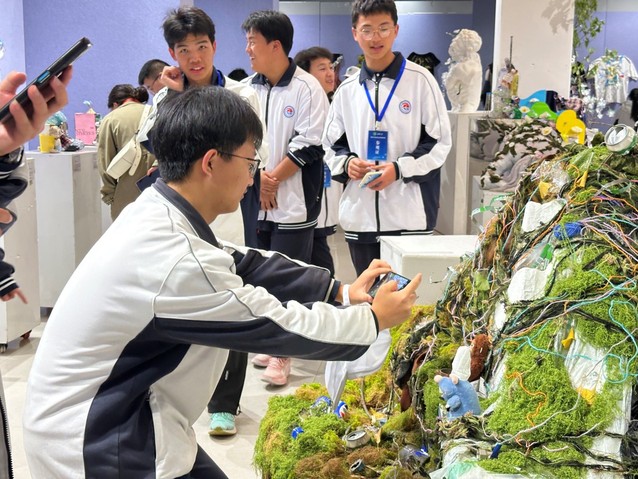 展览探索:科技与艺术 展览现场创意纷呈,师生们目不暇接。剑门关高级中学的李同学在一件采用再生材料的智能交互装置前驻足,轻触装置后光影流转,仿佛演绎着自然与科技的对话,实时变化的色彩模拟了森林生态的动态变化。“原来艺术可以如此生动有趣!”他兴奋地与同伴分享感受,并尝试与装置互动,亲身体验科技如何赋予艺术新的生命力。另一件由国际艺术大师与学院学生共创的装置作品同样引人注目:废弃物料与自然植被的场域,直观表达了生态与人类的共生关系,引发了同学们对环保的深入思考,甚至有同学现场讨论起如何将类似创意应用于校园环保项目。