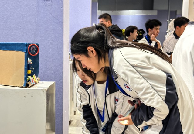 10月22日傍晚时分,西华大学美术与设计学院艺术大楼A座灯火通明,与秋夜的宁静相映成趣。一场以“从客体到主体——公共装置与智能交互”的课程展静候着远道而来的客人。在学校乡村振兴办公室、民盟西华大学总支主委于春老师,学校驻村干部李玉和副教授的带领下,广元市剑门关高级中学与朝天中学的90余名师生代表踏入展厅。废旧材料与智能技术碰撞出的火花,瞬间点燃了他们对艺术与科技的无限遐想——这场跨越地域的艺术之旅,就此启程。