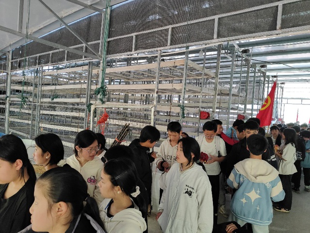 二、产业研学探奥秘,农桑蚕业“接地气” 走出党群服务中心,师生们深入田间地头与产业车间,开启“沉浸式”产业研学。在农桑种植基地,绿油油的桑园生机盎然,熊江书记为学生们讲解桑树品种选育、生态种植技术及桑叶在蚕业养殖中的核心作用,让同学们直观认识到“小桑叶”背后的“大产业”逻辑。随后,大家走进大蚕饲育车间,现代化的养蚕设施整齐排列,驻村工作队员详细介绍了西华大学在产业引进等方面的帮扶举措等。